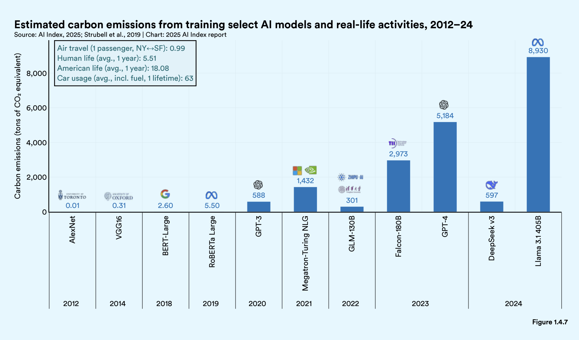 - The carbon emissions from training frontier AI models have steadily increased over time