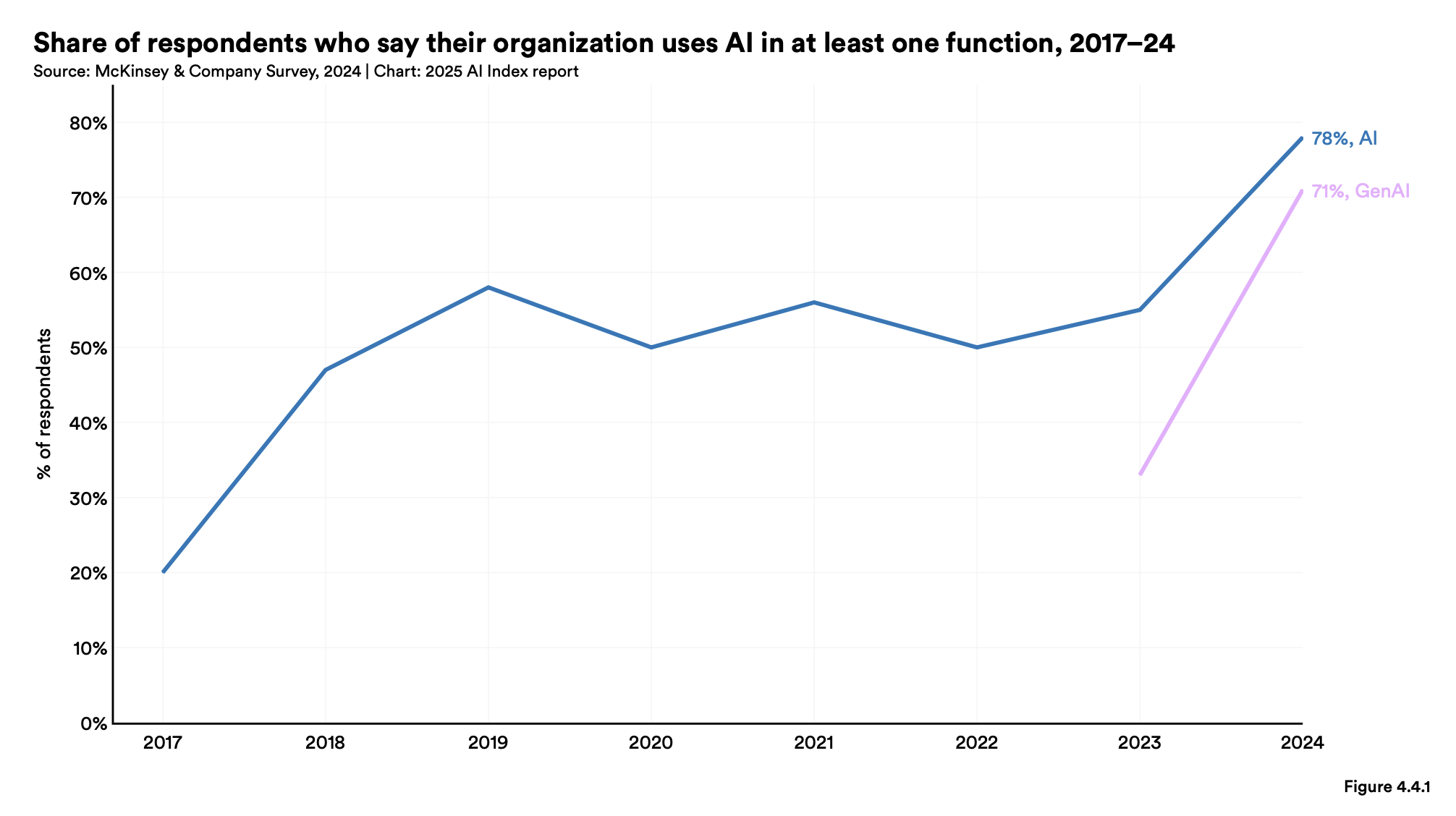 - Share of respondents who say their organisation uses AI in at least one function has jumped from 55% to 78% in 2024